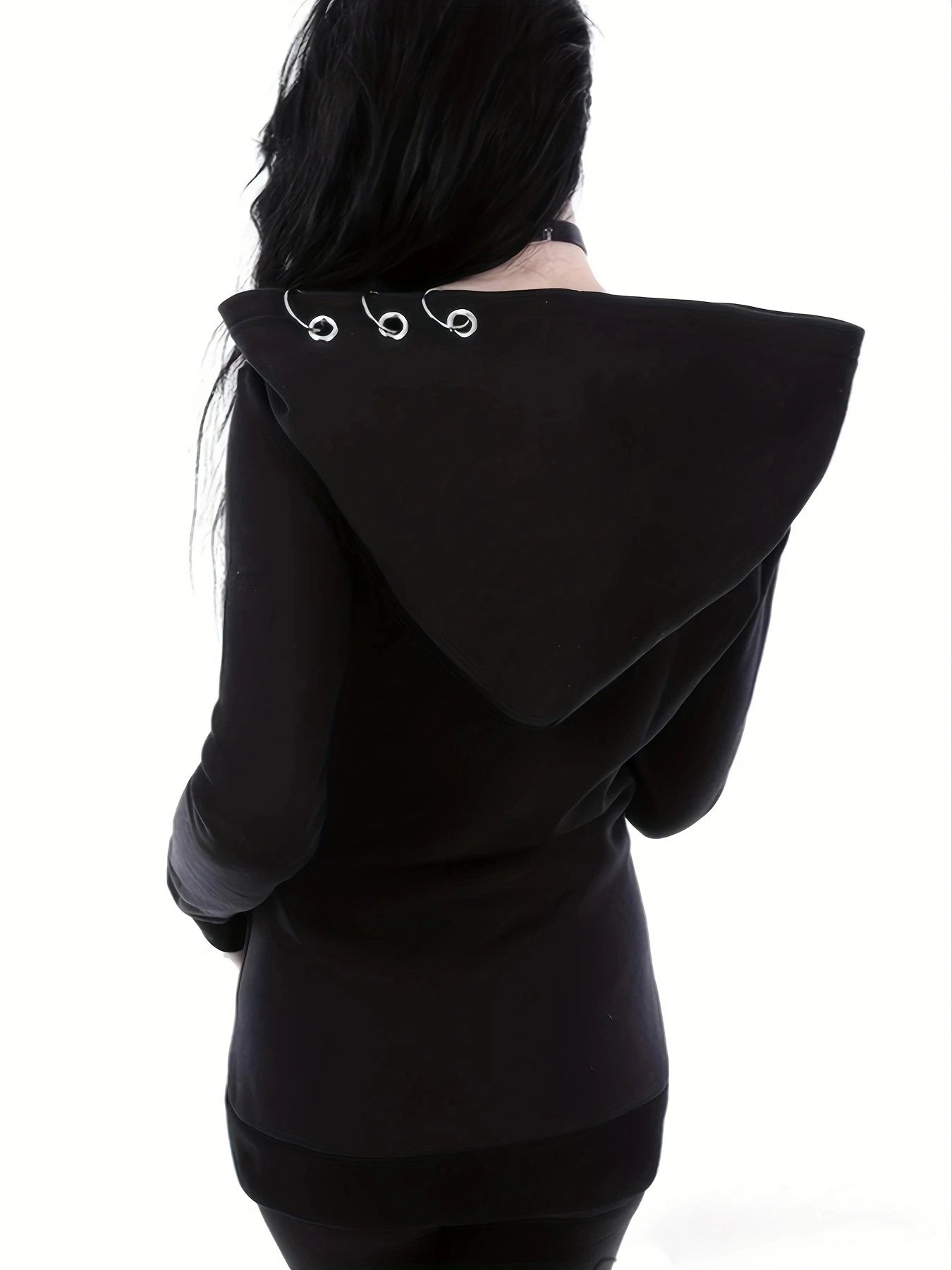 Black Zip up Hooded Cardigan with Metal Ring Detail on Hood, Pockets and Zip